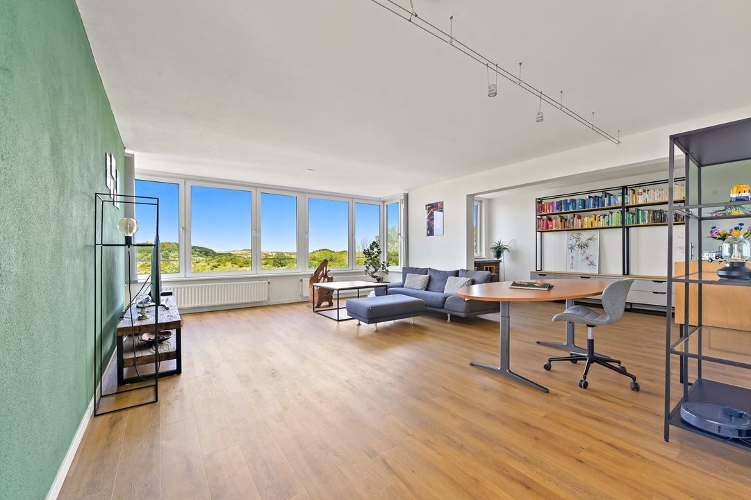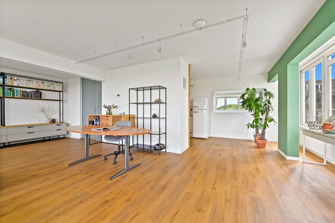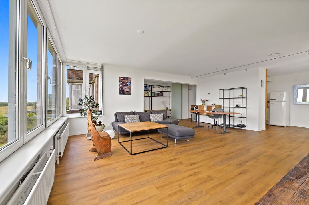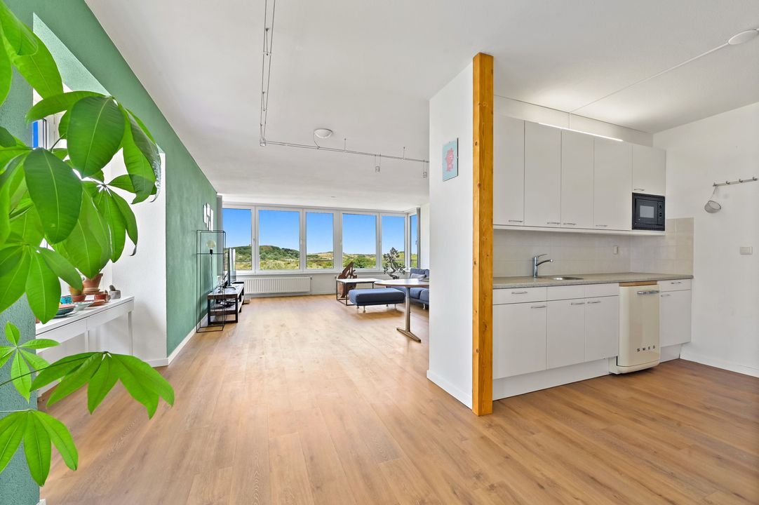 bouwjaar 2010) en opstelplaats voor de wasmachine/droger, royale lichte woon/eetkamer over de gehele breedte met veel lichtinval en prachtig vrij uitzicht over het beschermd natuurgebied Meijendel, semi open keuken