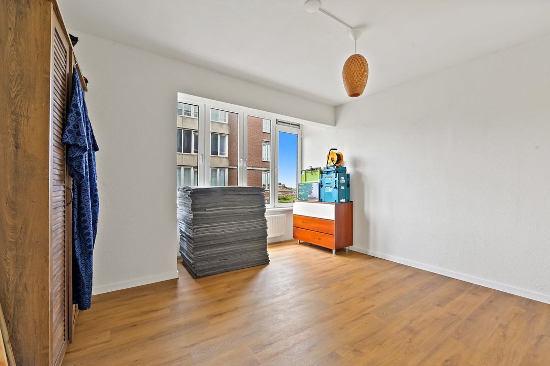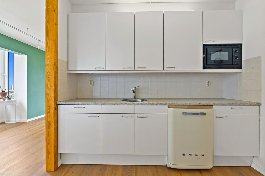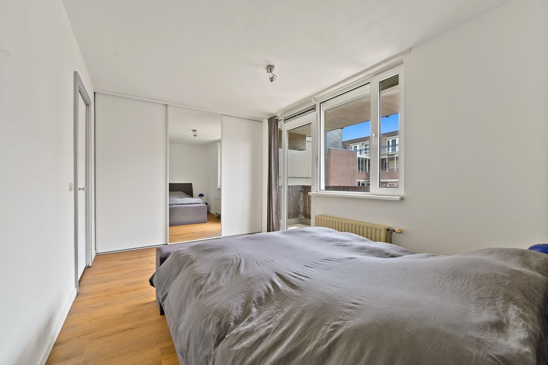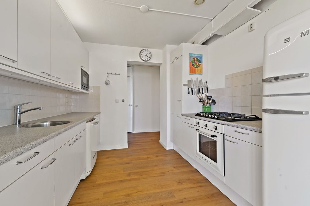 voorzien van magnetron, vaatwasser, koelkast, vriezer, gaskookplaat en oven. ruime hoofdslaapkamer aan de achterzijde met toegang tot het zonnige balkon op het zuidwesten en grote kastenwand, 2e slaapkamer, eveneens van goed formaat aan de zijkant gelegen, grote geheel betegelde nette badkamer met douche, wastafel, ligbad en 2e toilet. De woning is vrijwel geheel voorzien van een mooie PVC vloer.