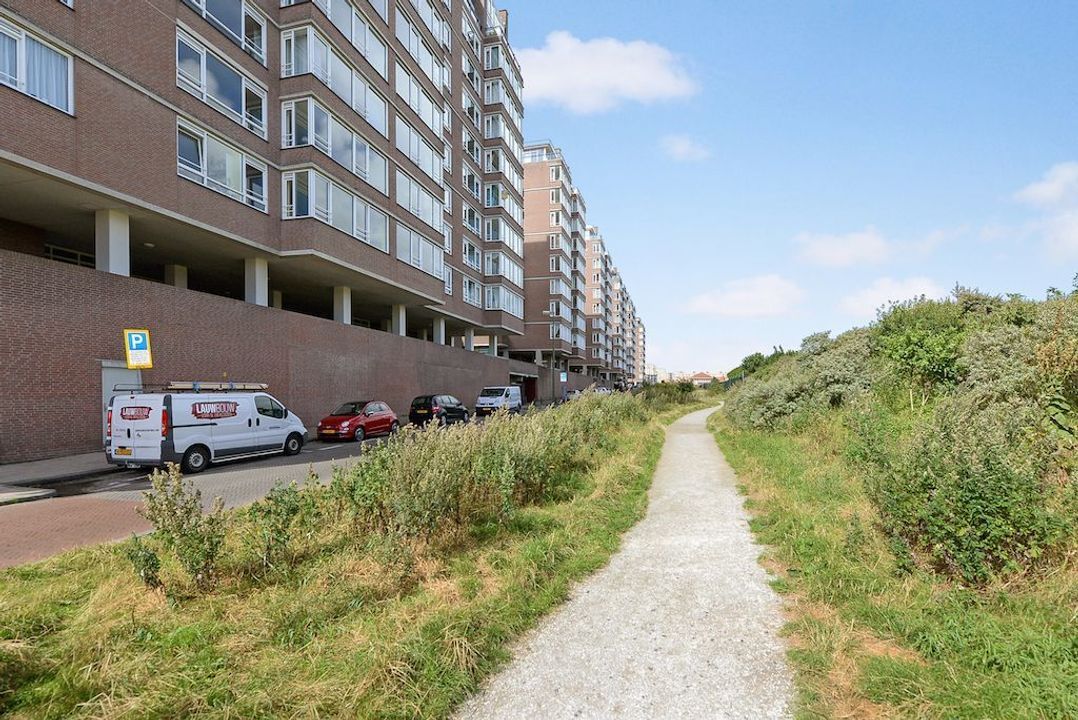 Gemeenschappelijke entree met brievenbussen, (dag- en nacht)bellentableaus, lift naar de 6e étage. Hal met meterkast en entree brandtrappenhuis, entree appartement. Gang met luxe toilet met fonteintje, ruime vaste garderobekast (betreft voormalig gastenbadkamer, aansluiting water nog aanwezig) en zeer ruime woonkamer over de gehele breedte van het appartement bestaande uit 2 kamers, met grote raampartijen en schitterend uitzicht over de duinen. Luxe Schmidt keuken in U-opstelling met composiet aanrechtblad voorzien van Siemens inbouwbouwapparatuur. De doorgang naar de woonkamer is hier afgesloten, maar vrij eenvoudig weer open te maken. Goed formaat slaapkamer met toegang tot het zonnige balkon op het Zuidwesten met vrij uitzicht over de skyline van Den Haag en Hoek van Holland. Riante masterbedroom met doorloop naar luxe badkamer met inloopdouche, toilet, wastafelmeubel, badkamer spiegelkast en handdoekradiator. Handige interne berging met CV ketel en aansluiting voor de wasmachine en droger.