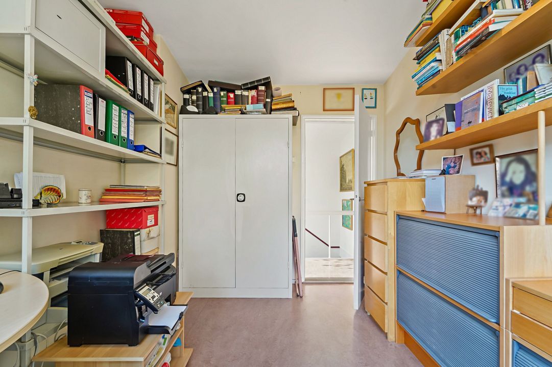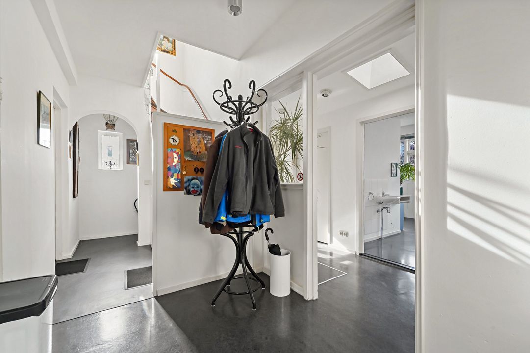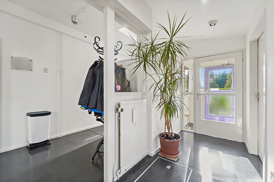 Vanuit de woonkamer deur naar gang met garderobe, trap naar de 1e verdieping, toilet en slaap-/werkkamer.