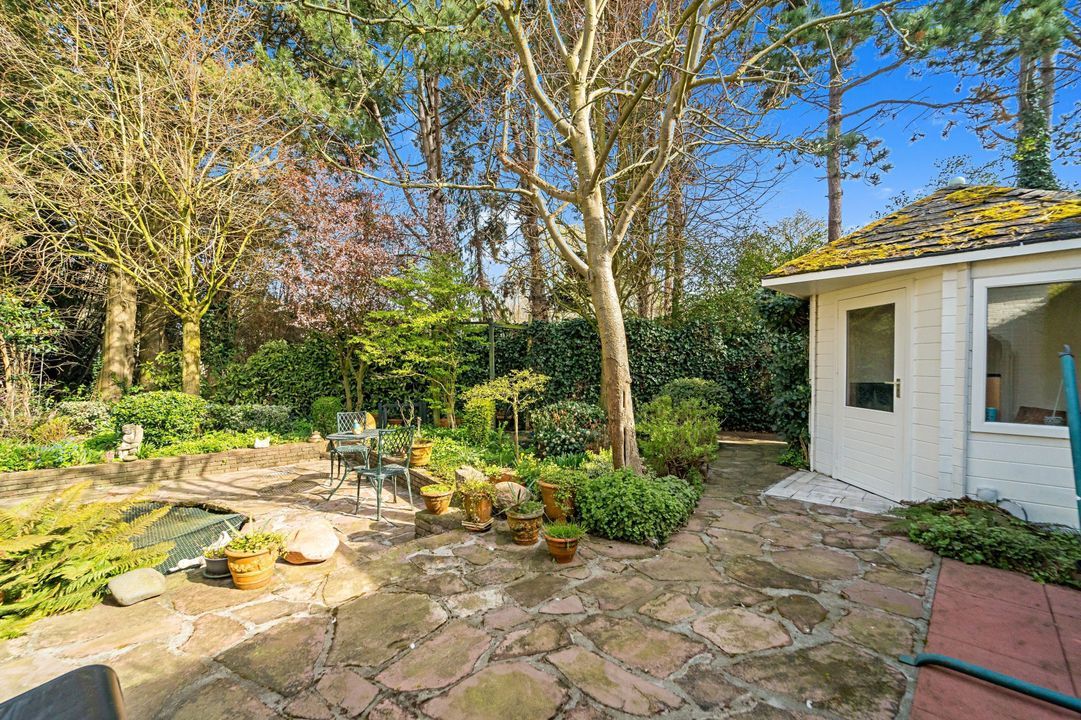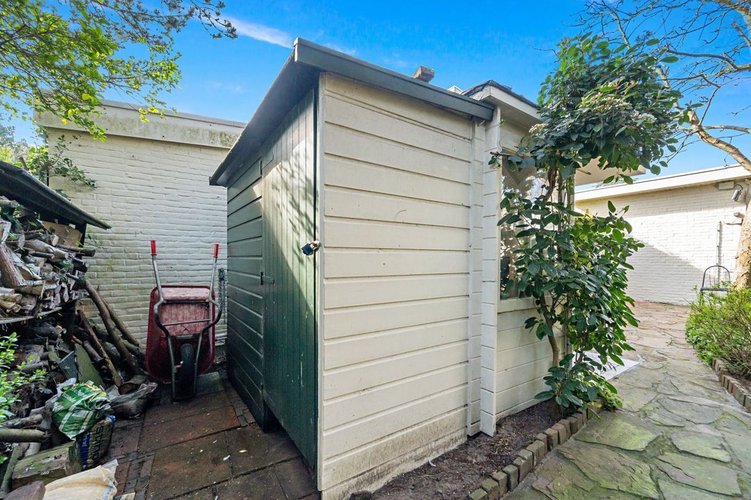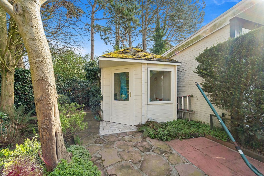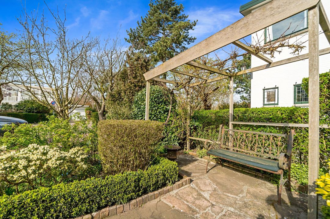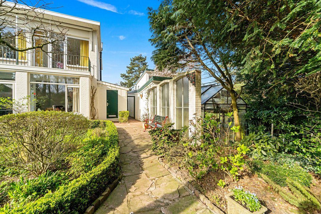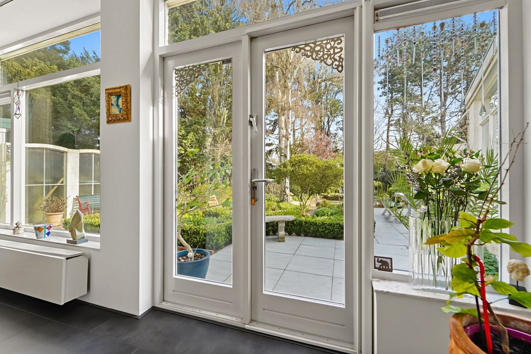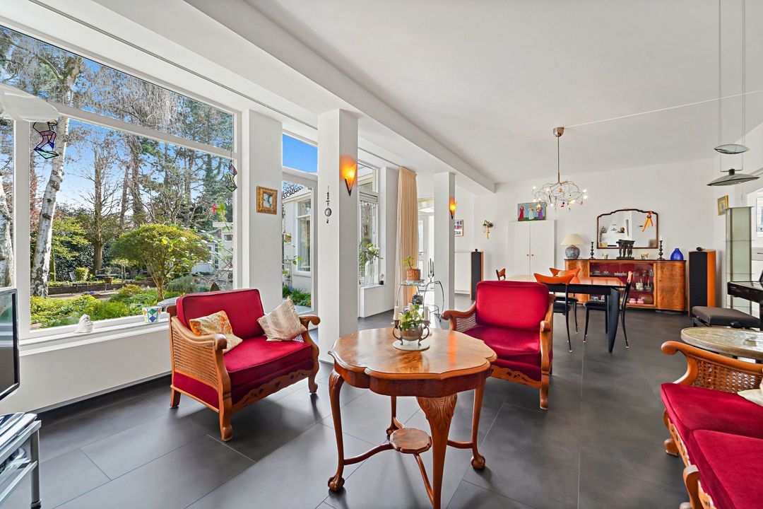 Tuingerichte living met open haard, grote raampartijen en openslaande deuren naar de zonnige, fraai aangelegde achtertuin met diverse terrassen, prieel, schuur, en berging; naast het huis pad naar voortuin.