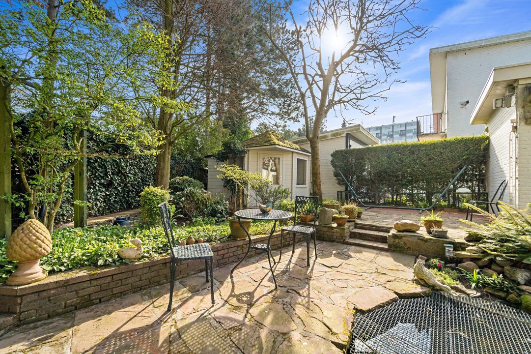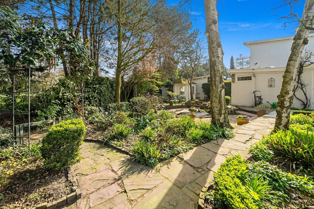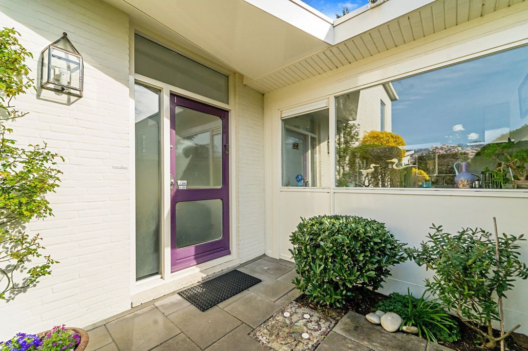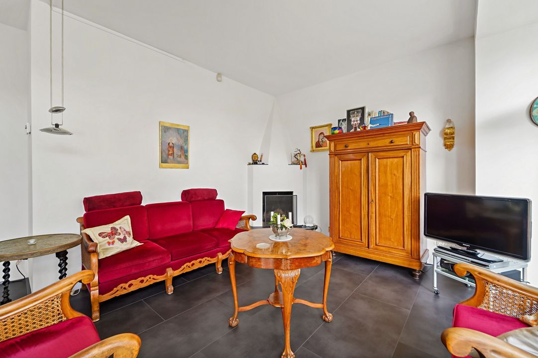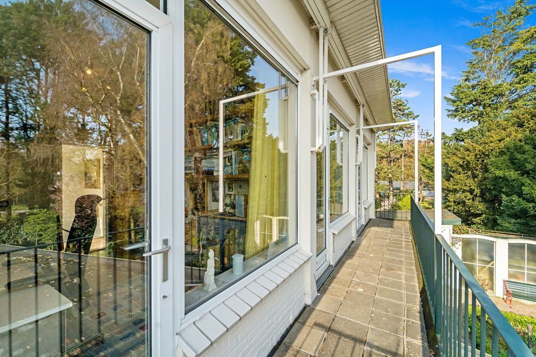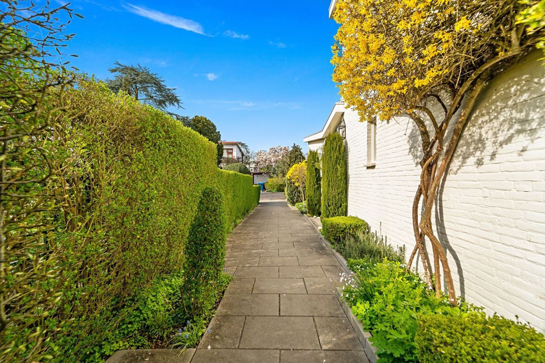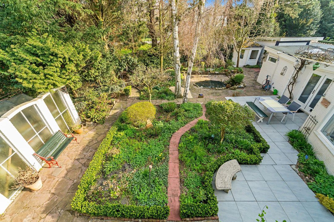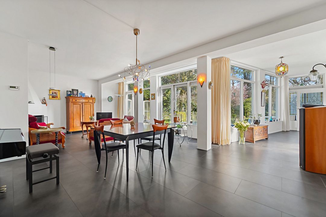 Tuingerichte living met open haard, grote raampartijen en openslaande deuren naar de zonnige, fraai aangelegde achtertuin met diverse terrassen, prieel, schuur, en berging; naast het huis pad naar voortuin.