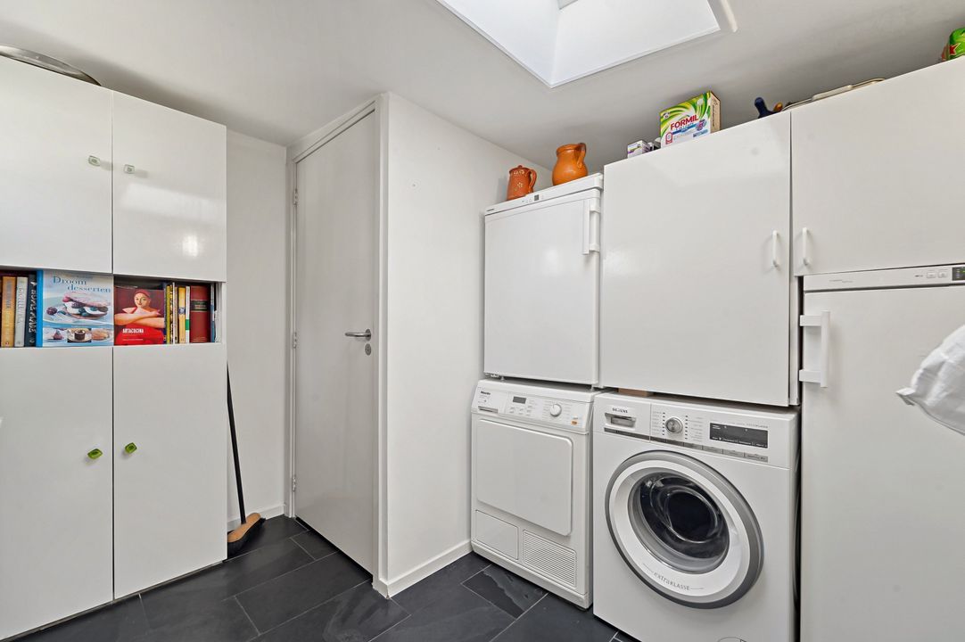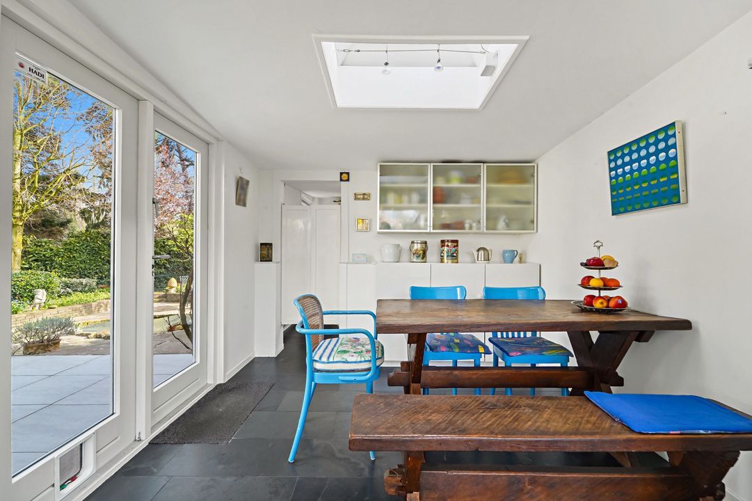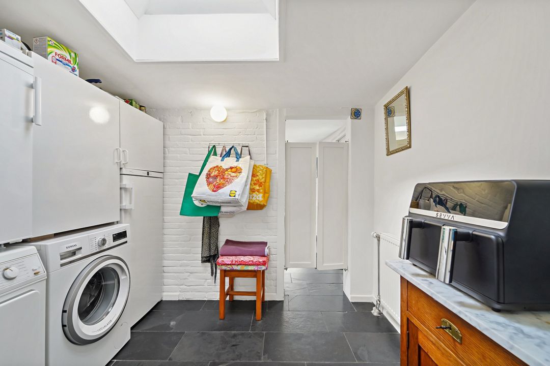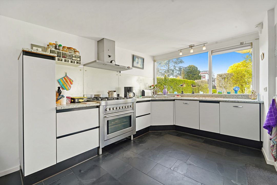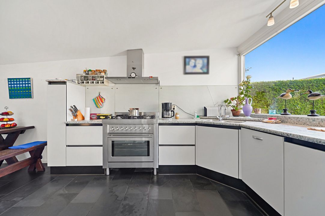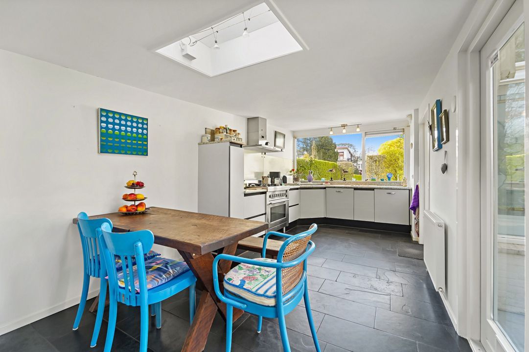 Via voortuin pad naar entree woning; doorloop naar de grote woonkeuken met dakraam, inbouwapparatuur, natuurstenen vloer met vloerverwarming, openslaande deuren naar de achtertuin, deur naar bijkeuken met wasruimte en separaat toilet.