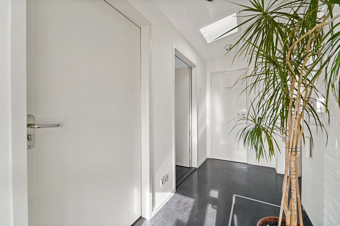 Eigen entree, vestibule, gang met dakraam en ruime interne berging, toilet, grote L-voorkamer.