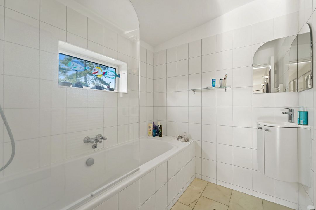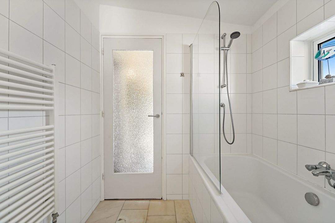 Overloop met grote raampartij, twee diepe vaste kasten met ook de opstelplaats voor de CV-combiketel; 3e toilet, nette badkamer voorzien van ligbad, wastafel.