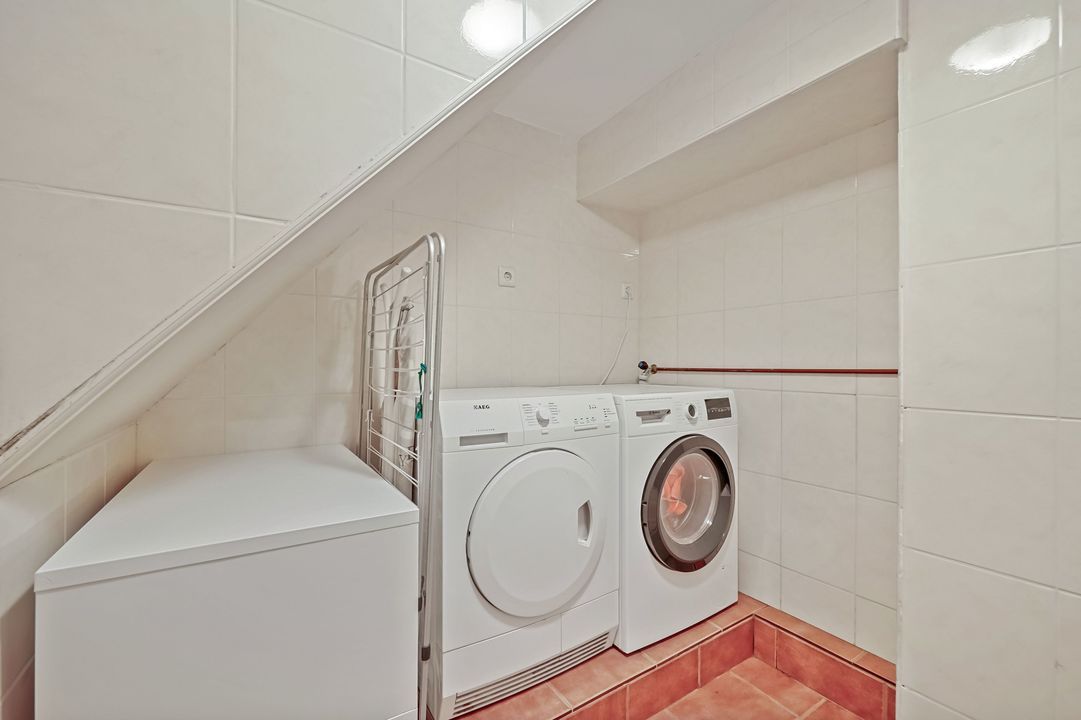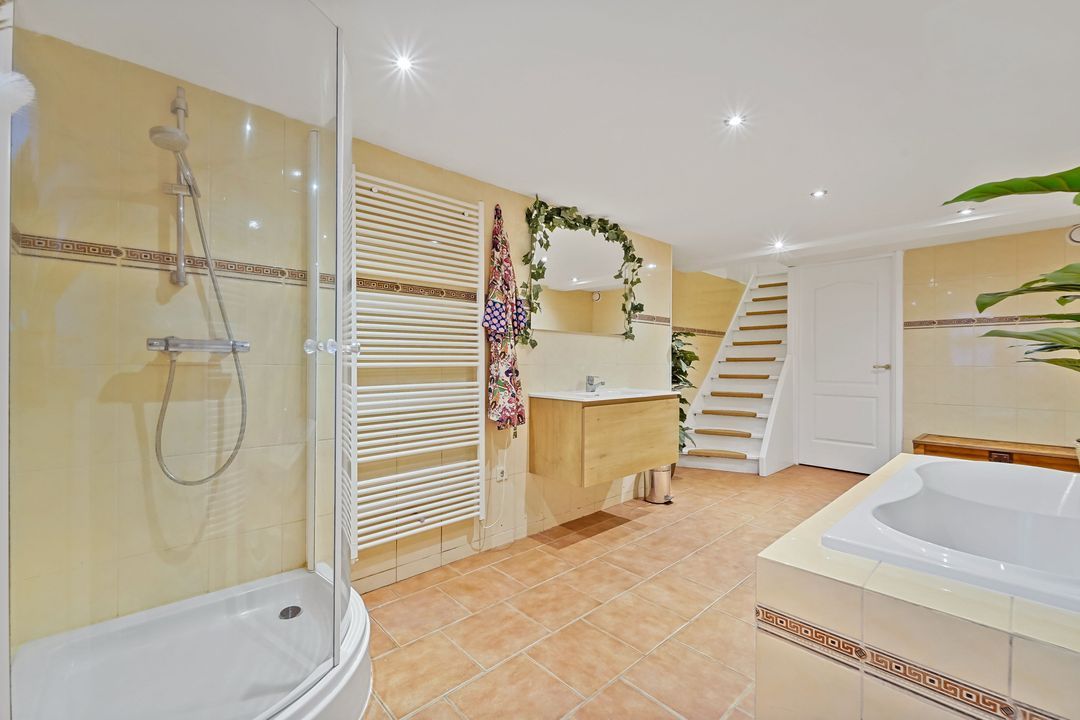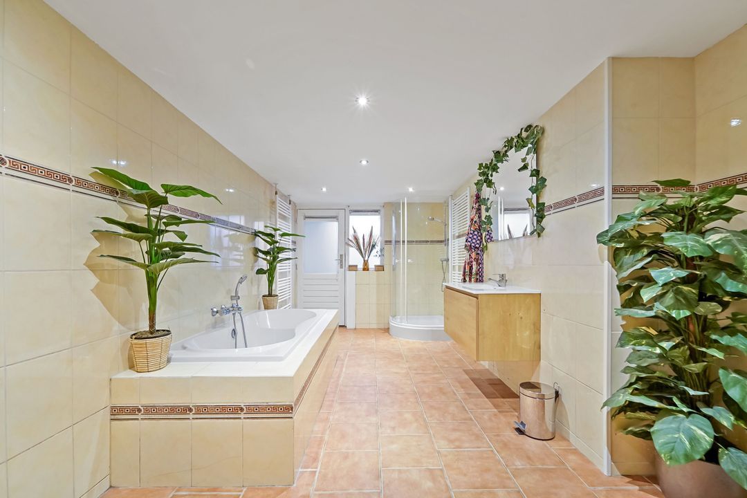 (geheel betegelde) badkamer voorzien van ligbad (duo), wastafelmeubel, douche, handdoekradiator en mechanische ventilatie, ruime afgescheiden wasruimte met opstelplaats wasmachine/droger en tevens voorzien van mechanische ventilatie en waterpomp. De badkamer heeft een kelderraam en deur met toegang tot trap omhoog naar