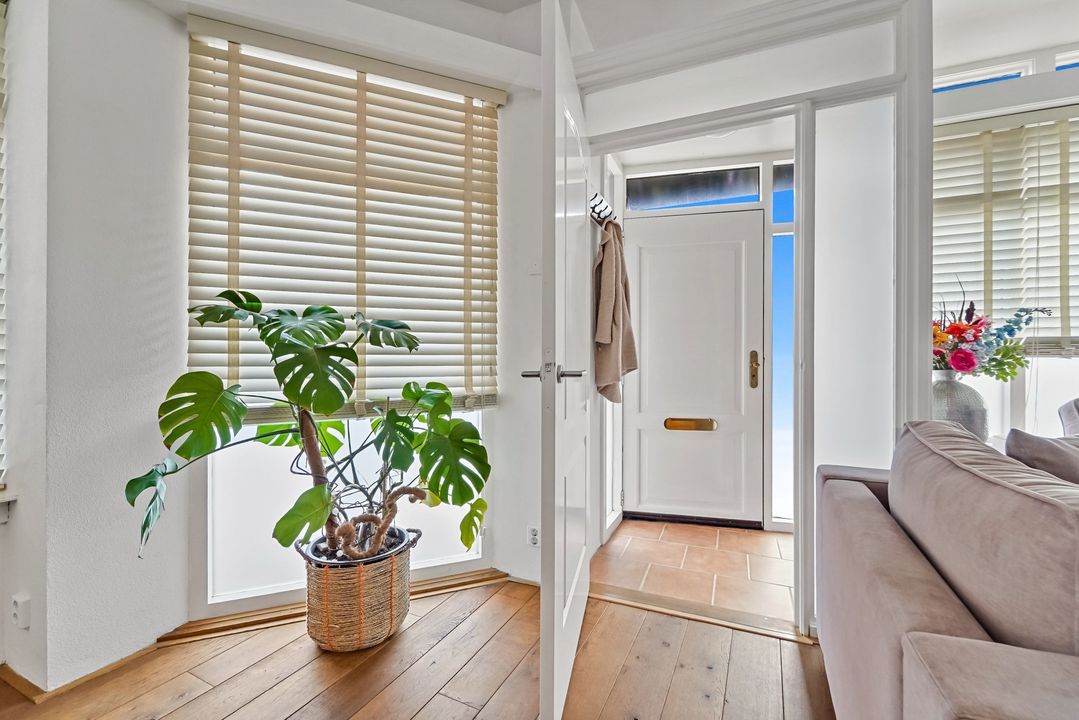 Entree woning op straatniveau: hal, royale en zeer lichte (hoek) woonkamer en trapkast,