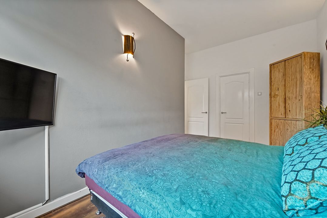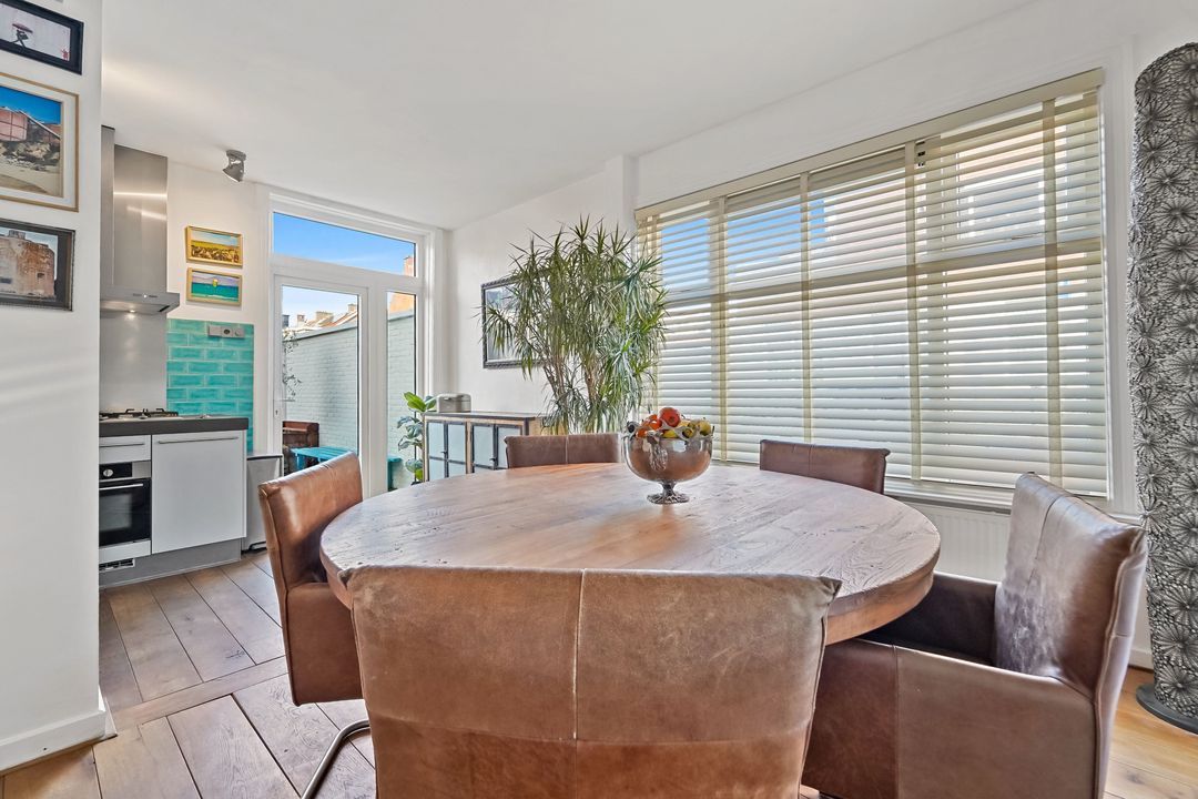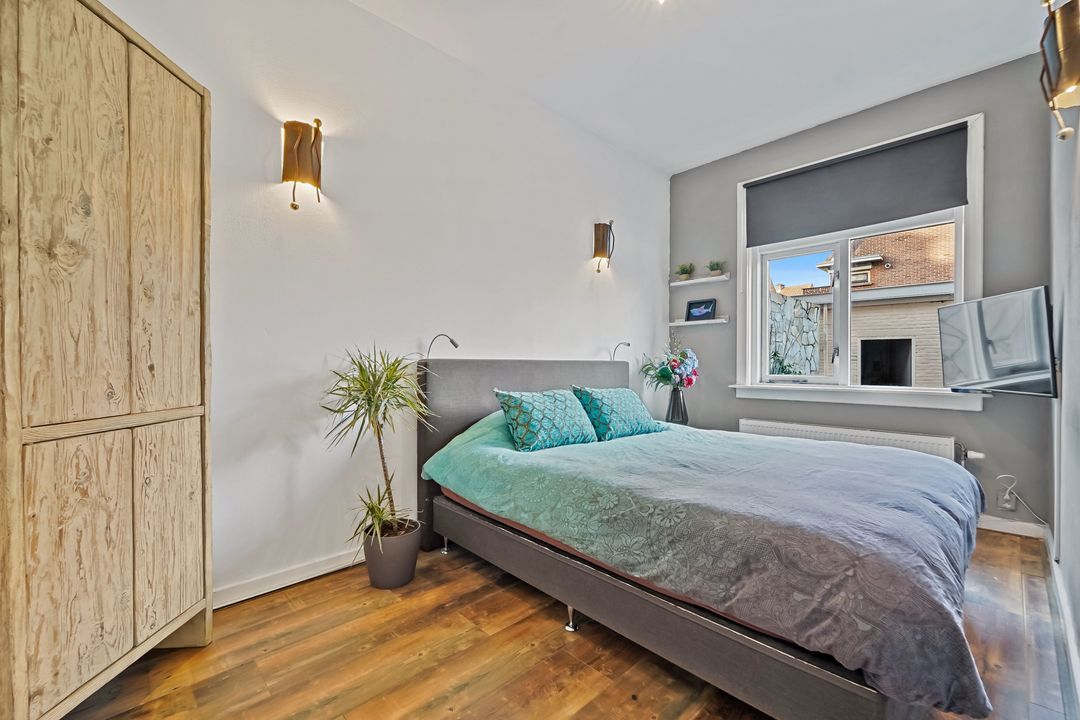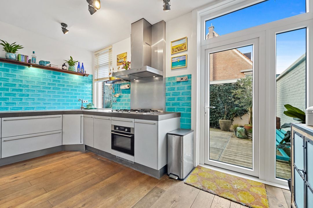 Aan de achterzijde gelegen ruime slaapkamer met toegang tot grote inloopkast (ca 4m2), tussengelegen 2e slaapkamer, riante (bijgetrokken kamer) woonkeuken (2018) voorzien van diverse inbouwapparatuur en toegang tot verzorgde zonnige achtertuin met afgeschermde buitendouche, zij-ingang (openslaande deuren) en toegang tot