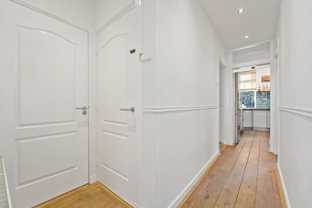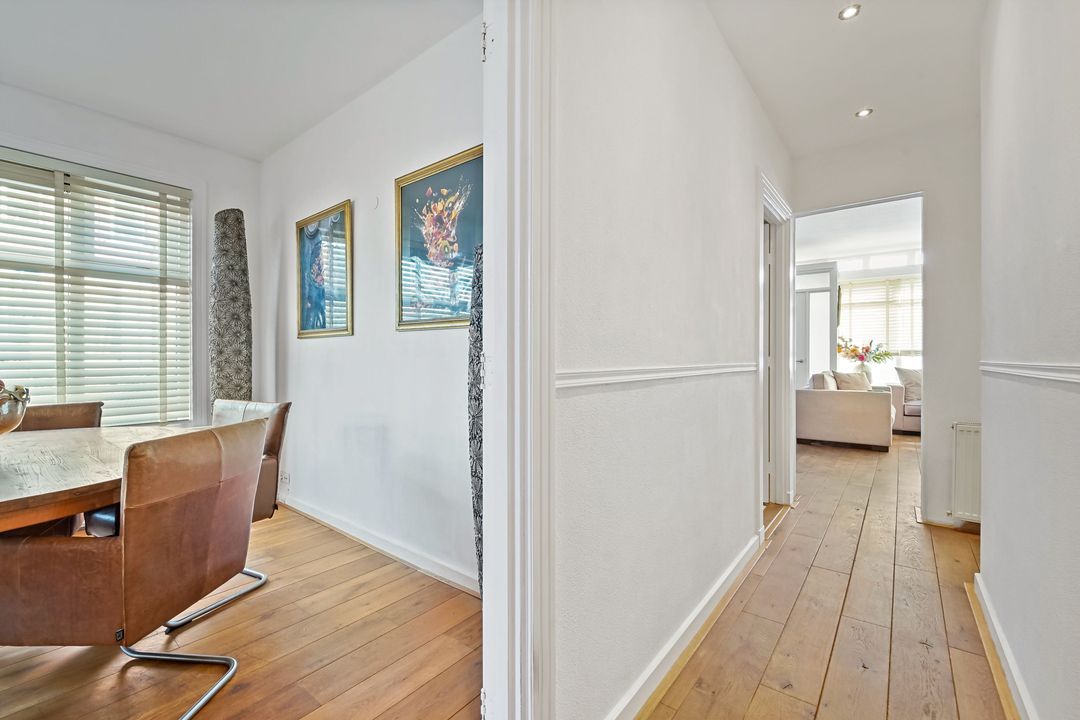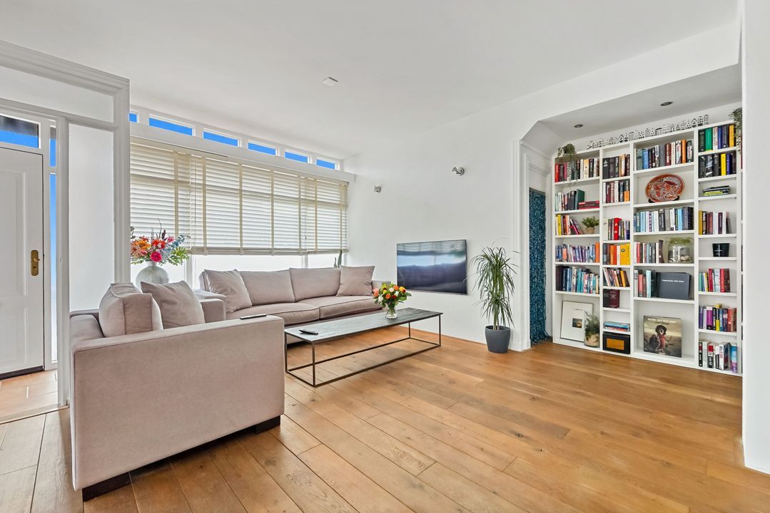 Entree woning op straatniveau: hal, royale en zeer lichte (hoek) woonkamer en trapkast,