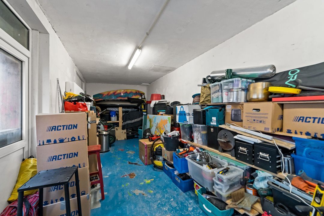 De garage/bedrijfsruimte (ca 47m2) is voorzien van elektrische garagedeur met afstandsbediening, elektra en opstelplaats CV-combiketel (Daalderop, bouwjaar 2015), houten deur naar de tuin en kunststof openslaande deuren voorzien van dubbel glas (momenteel niet in gebruik ivm voorzetwandje buitendouche.